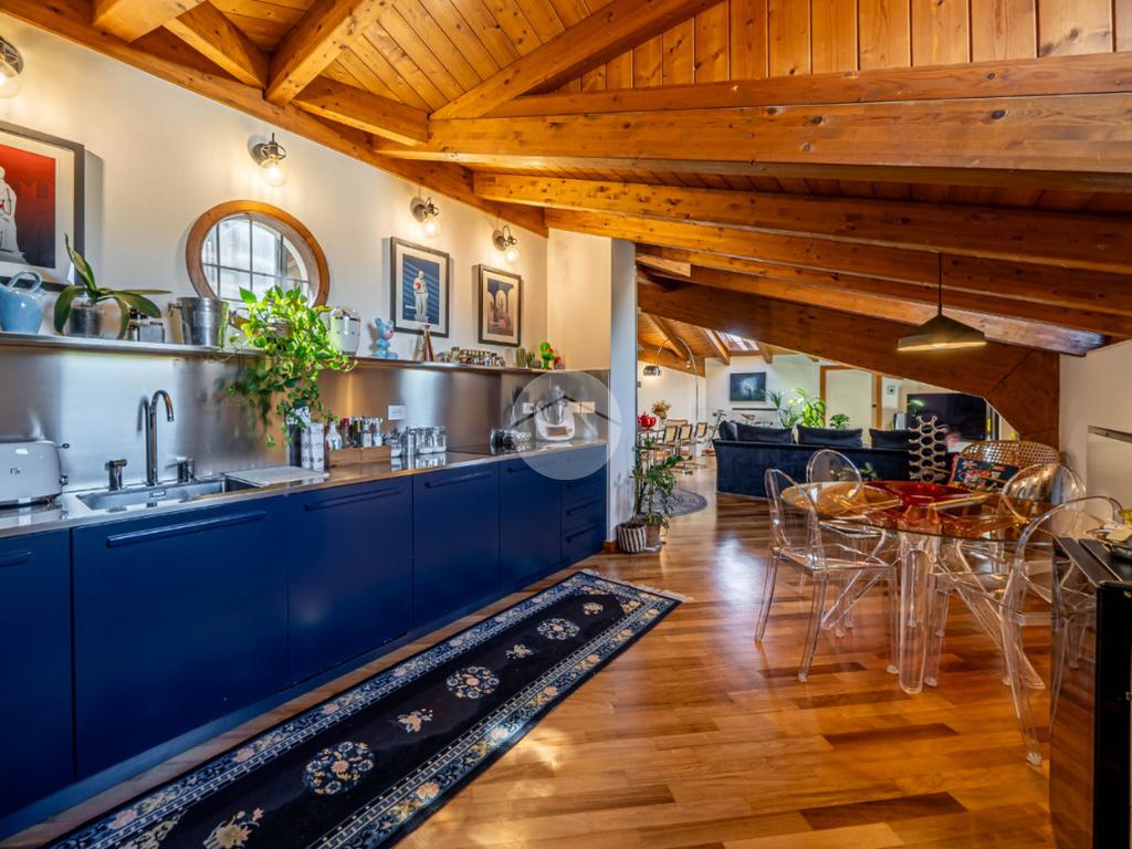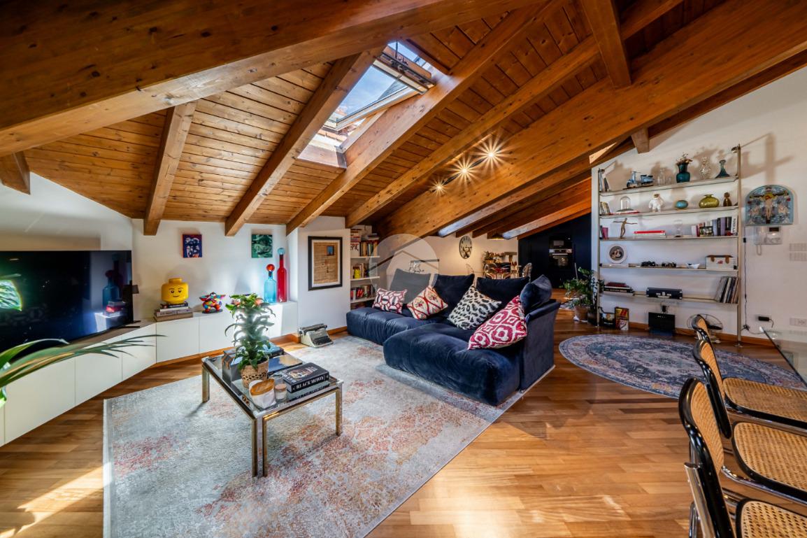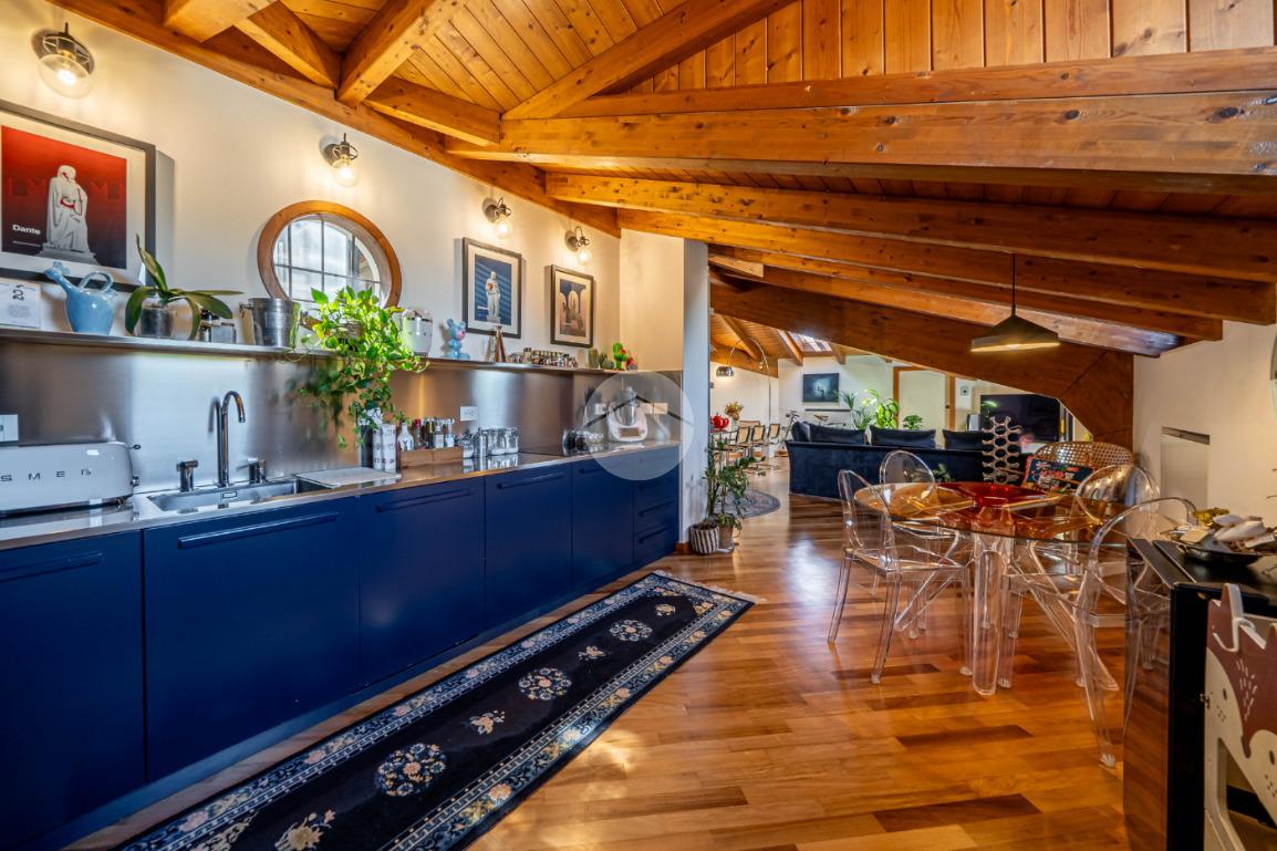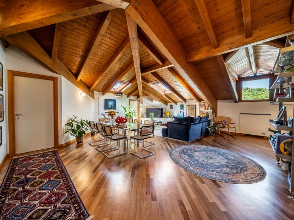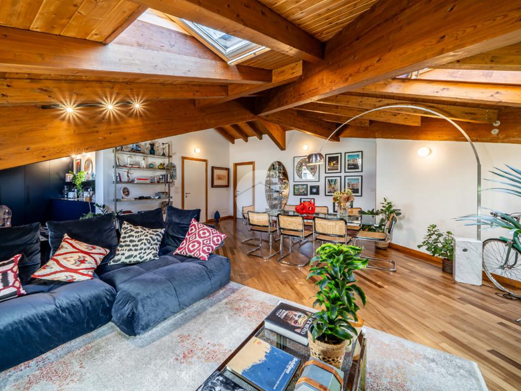 L’appartamento si caratterizza per una grande luminosità, grazie alle ampie finestre e ai Velux che permettono alla luce naturale di entrare in ogni ambiente. L’ingresso accoglie subito gli ospiti in un ampio soggiorno, che offre uno spazio perfetto per rilassarsi o intrattenere. Adiacente troviamo l’angolo cottura che si integra elegantemente con la zona pranzo, creando un ambiente conviviale e funzionale.