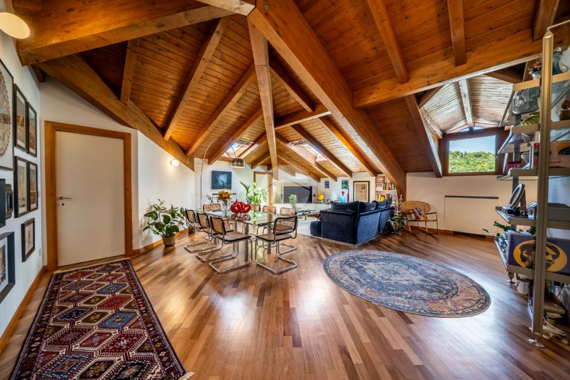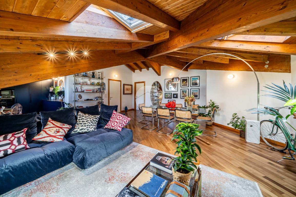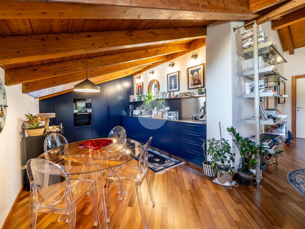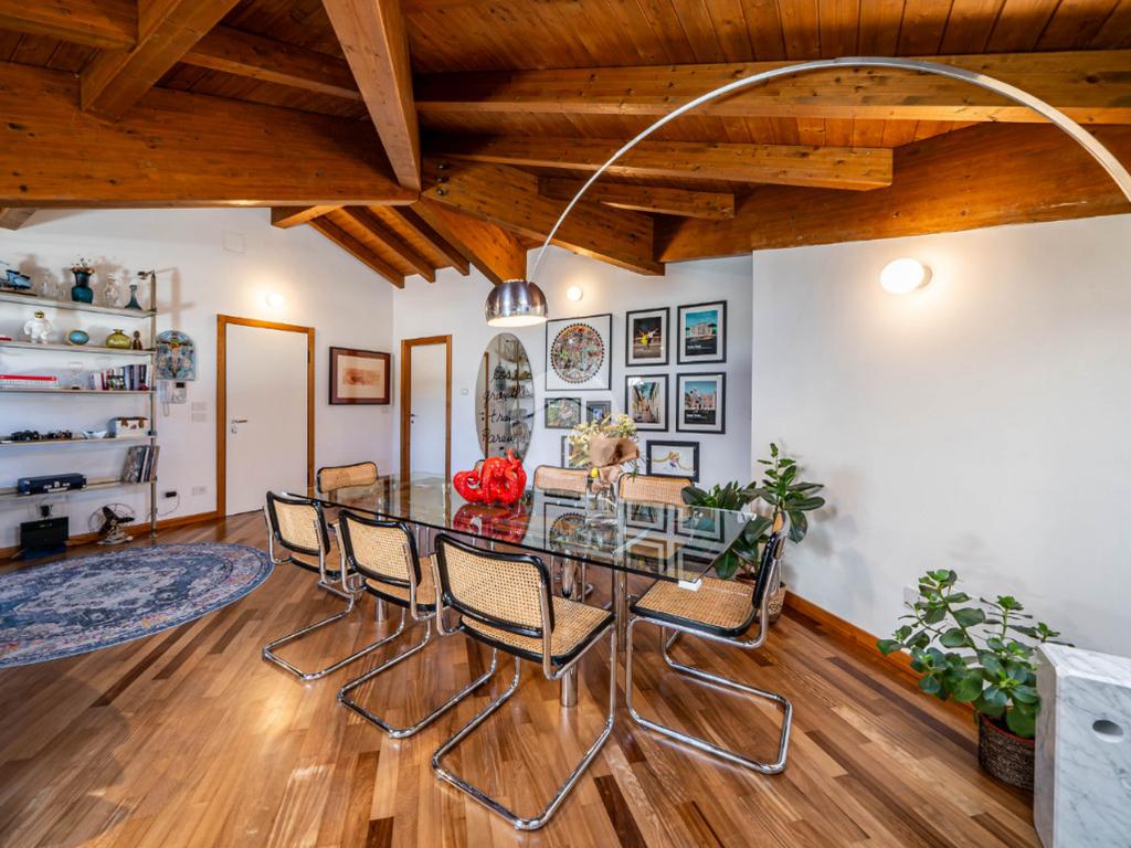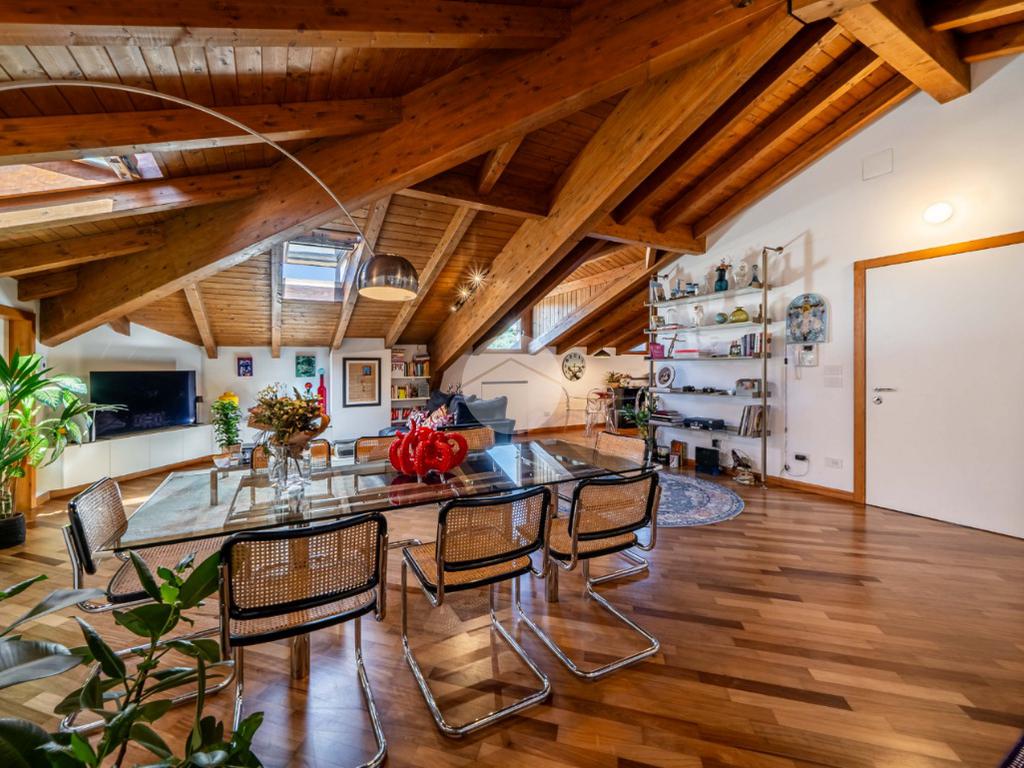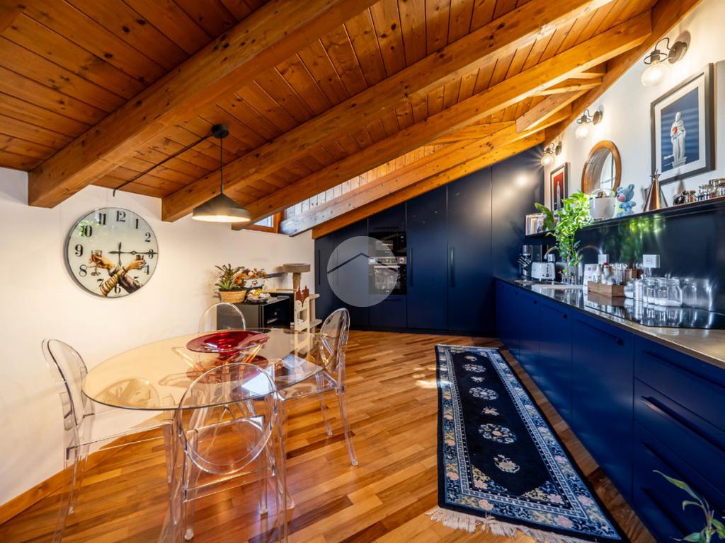 L’appartamento si caratterizza per una grande luminosità, grazie alle ampie finestre e ai Velux che permettono alla luce naturale di entrare in ogni ambiente. L’ingresso accoglie subito gli ospiti in un ampio soggiorno, che offre uno spazio perfetto per rilassarsi o intrattenere. Adiacente troviamo l’angolo cottura che si integra elegantemente con la zona pranzo, creando un ambiente conviviale e funzionale.