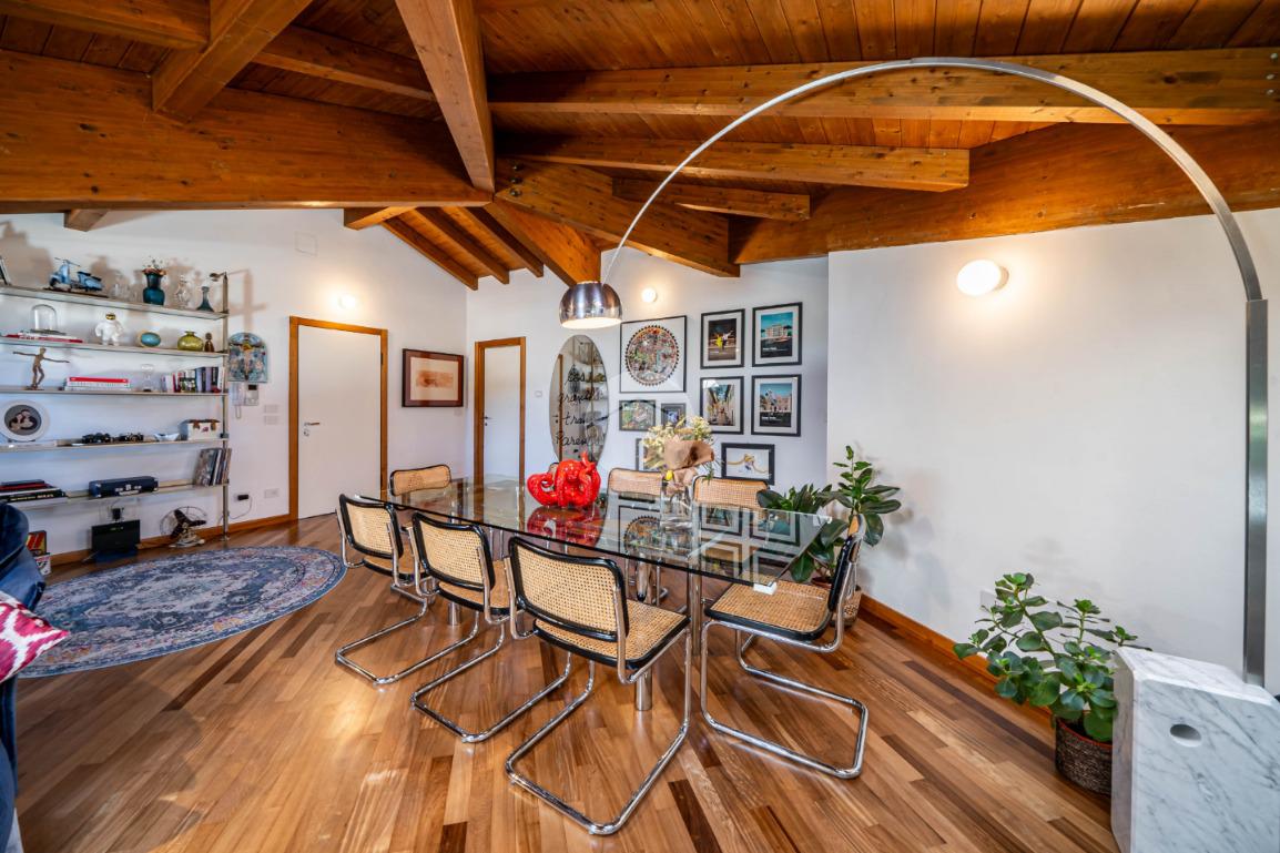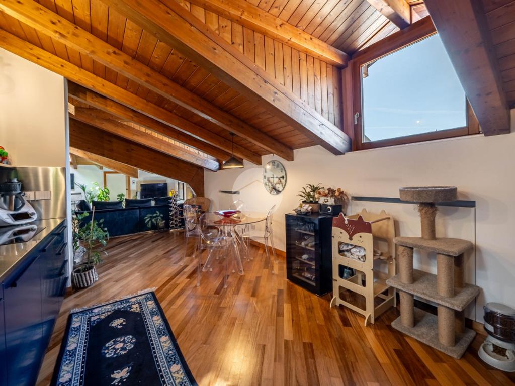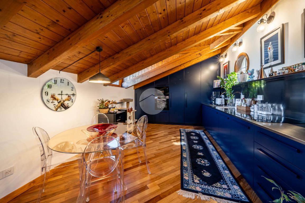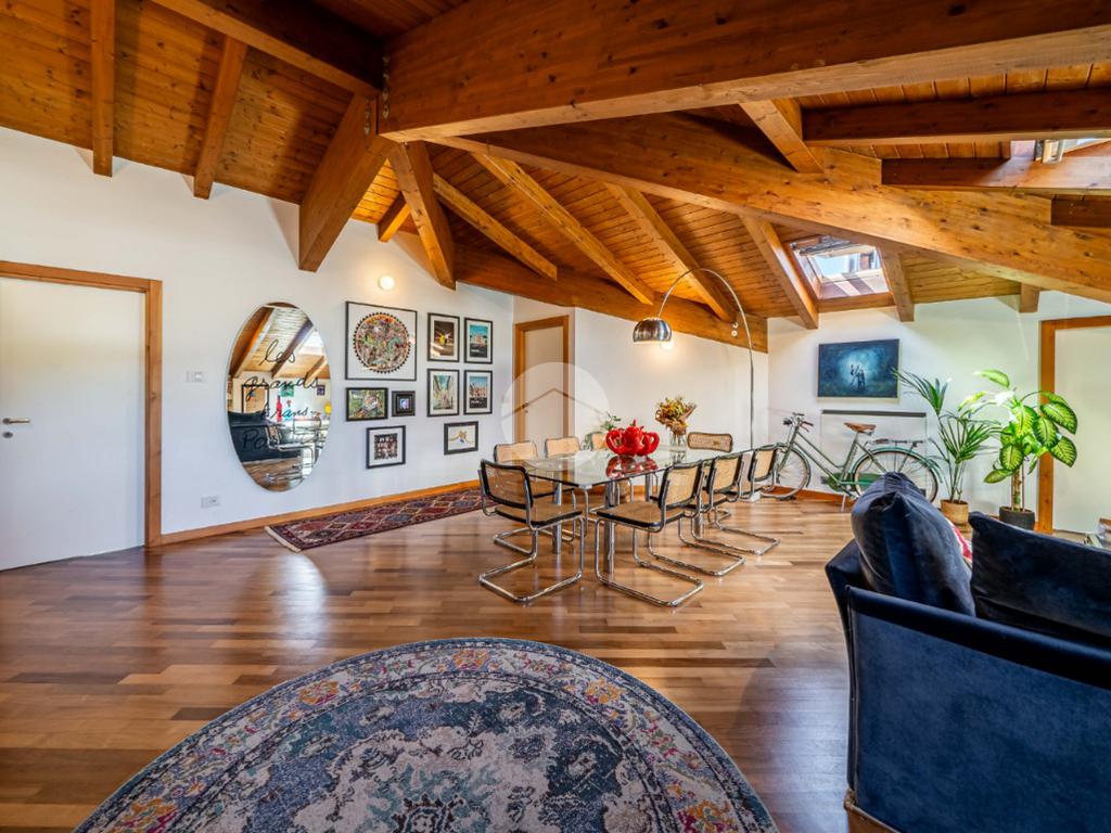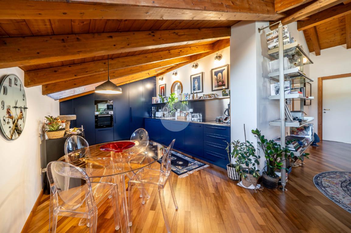 L’appartamento si caratterizza per una grande luminosità, grazie alle ampie finestre e ai Velux che permettono alla luce naturale di entrare in ogni ambiente. L’ingresso accoglie subito gli ospiti in un ampio soggiorno, che offre uno spazio perfetto per rilassarsi o intrattenere. Adiacente troviamo l’angolo cottura che si integra elegantemente con la zona pranzo, creando un ambiente conviviale e funzionale.