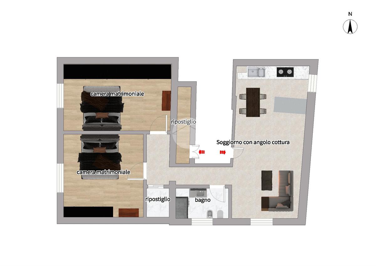 L’appartamento, caratterizzato da una piacevole tripla esposizione, si compone di un’accogliente zona giorno con angolo cottura, due spaziose camere matrimoniali, bagno finestrato, pratica lavanderia e un comodo ripostiglio esterno.